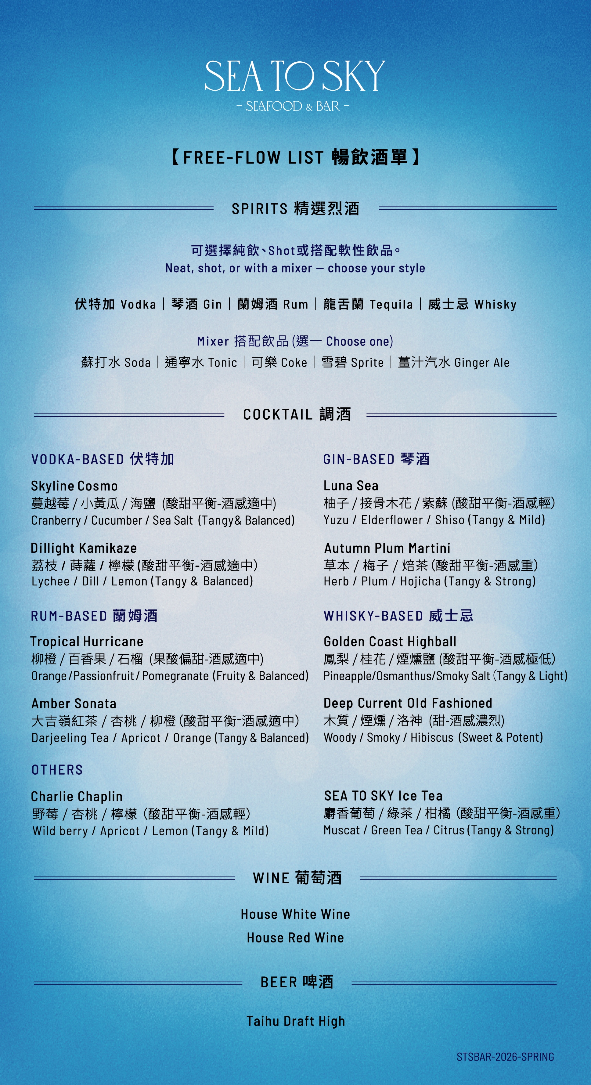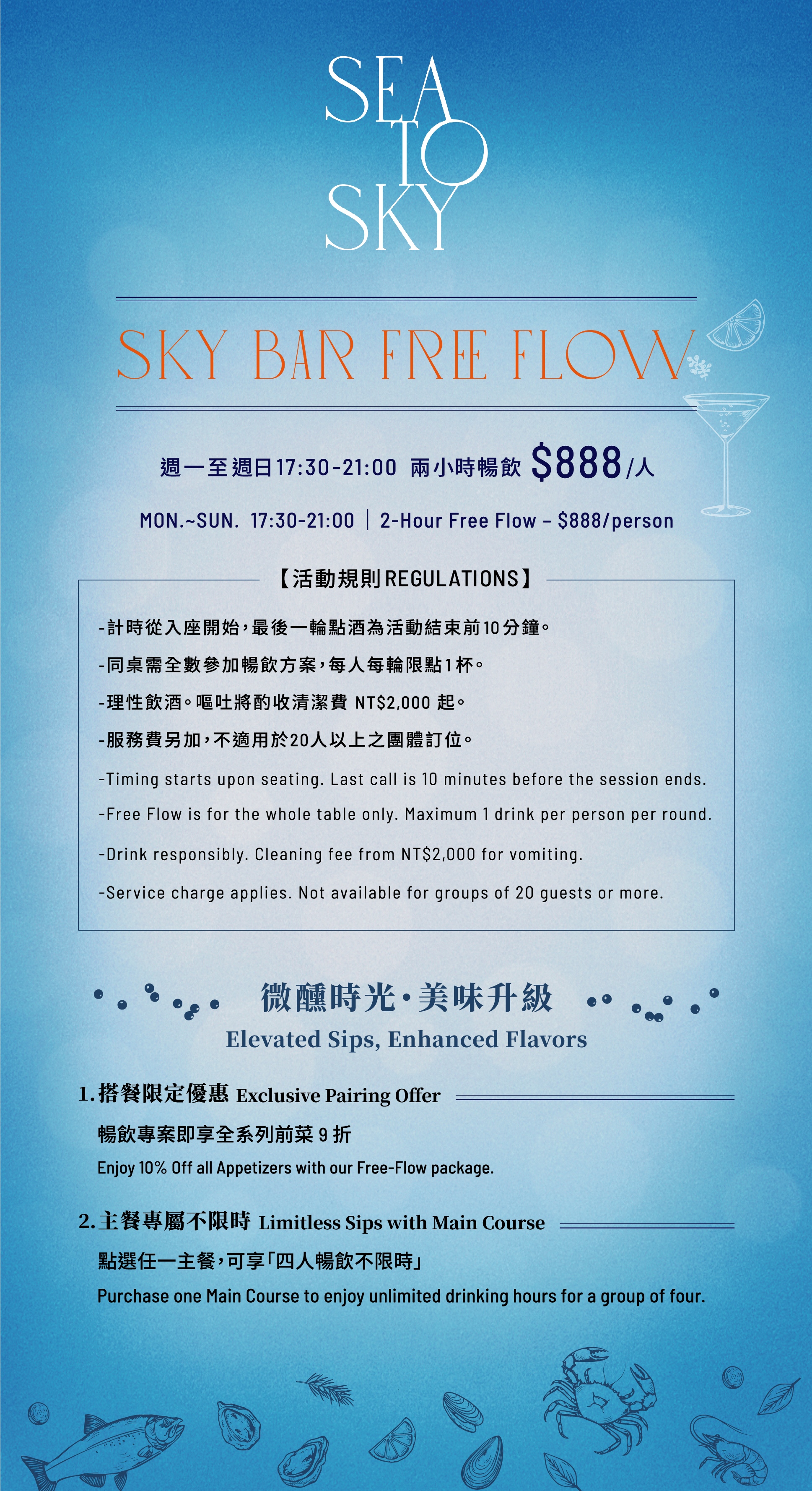 當夕陽染上信義天際,登上 SEA TO SKY 高空酒吧,夜晚的微醺序曲就此揭開。每人只需 $888,不分平假日皆可暢飲兩小時。十款風味調酒、紅白酒、精釀啤酒與各式烈酒,。快樂不設限,為相聚時刻盡情舉杯!