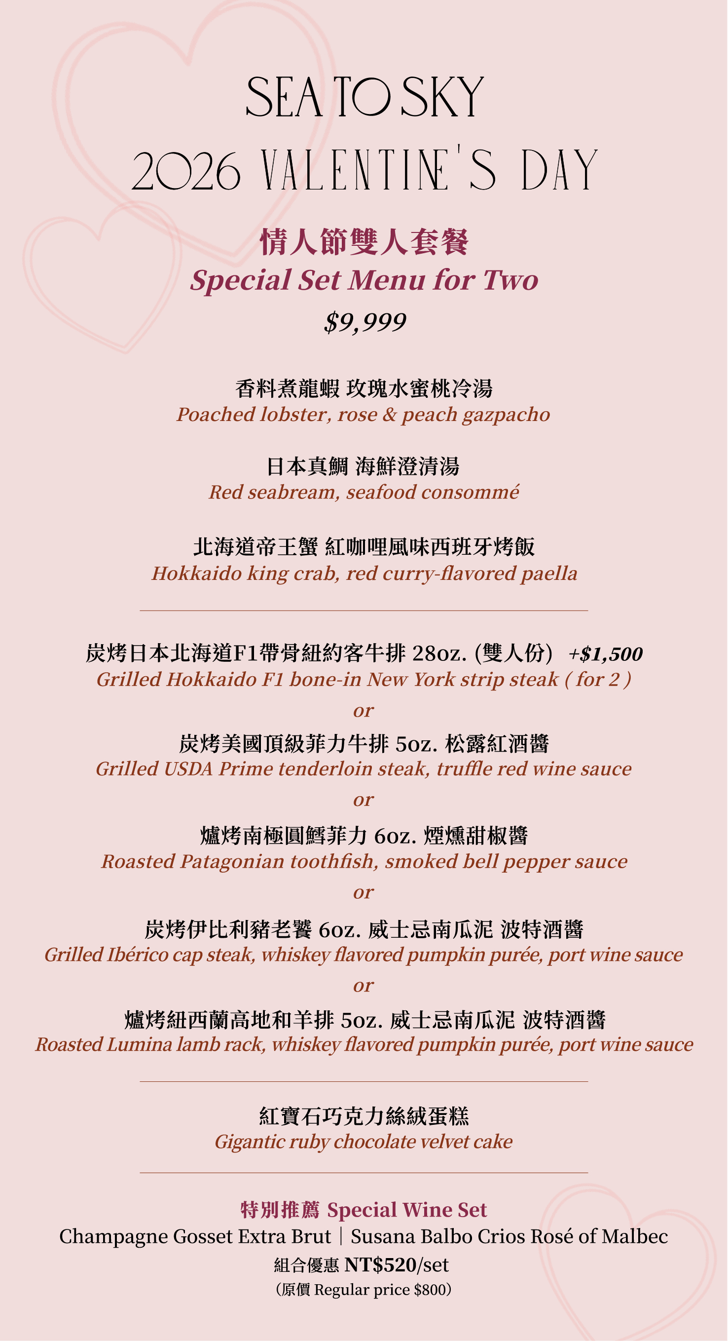 當精緻佳餚遇上迷人酒韻,讓愛意隨氣泡在餐桌上升溫。凡選購情人節雙人套餐,可享 $520 加購「Gosset 經典香檳 與 Susana Balbo 粉紅酒」套組(原價 NT$800)。品味百年香檳的細緻氣泡與粉紅酒的優雅果香,在微醺中留下難忘的永恆時刻。