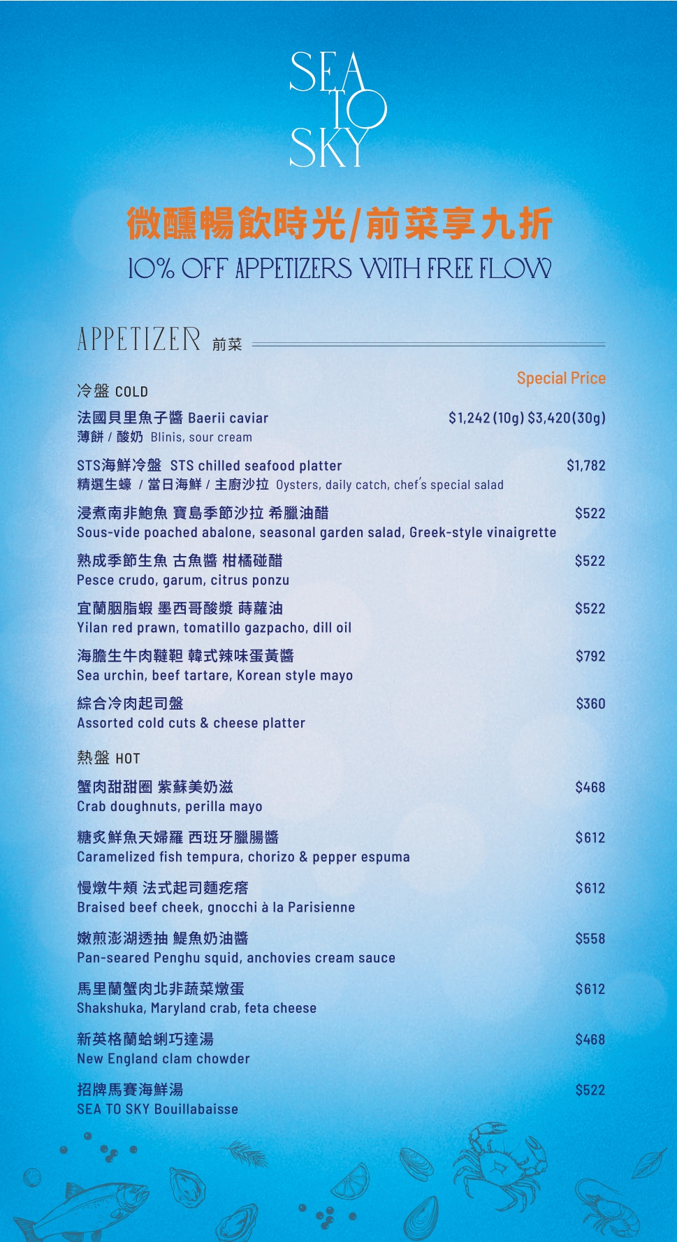 •凡選用暢飲方案,即享當日餐廳全品項前菜 9 折優惠(單點價格計算)